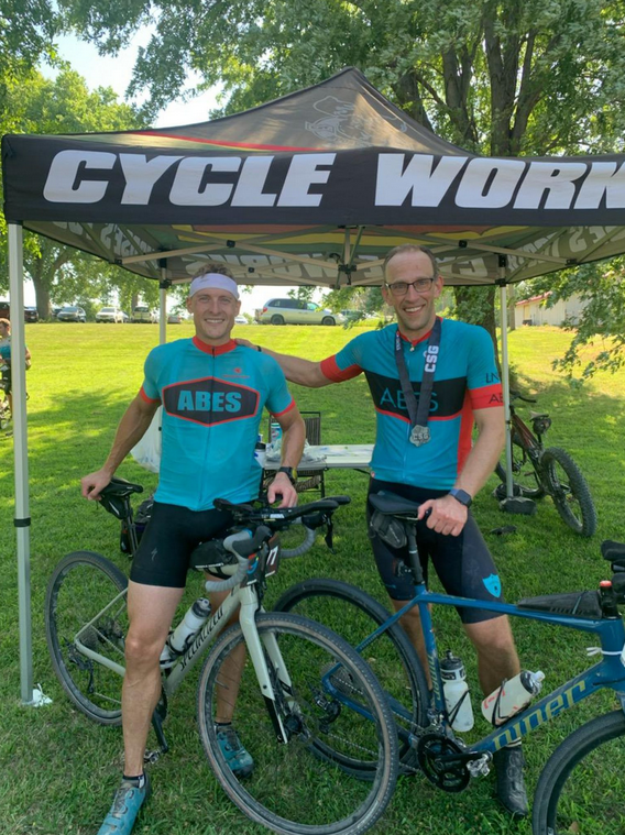 I flew on fumes back into Pawnee State Park and let my tires roll thunkety-thunk over the electronic finish line. There, I saw another man in a black and grey jersey relaxing beside his bike in the shade of a maple tree. And I saw Jason Cyboron, the race director, walking toward me, offering a golden smile and a decidedly grey medal. I smiled back and shook my head.